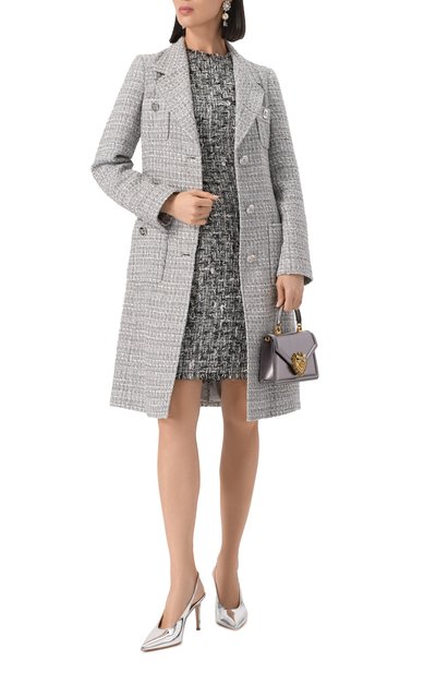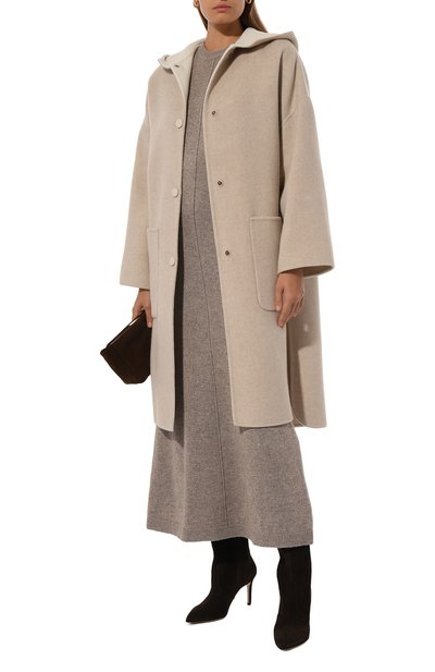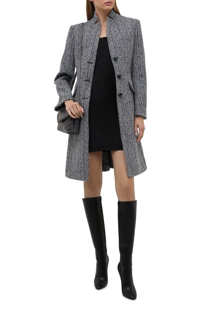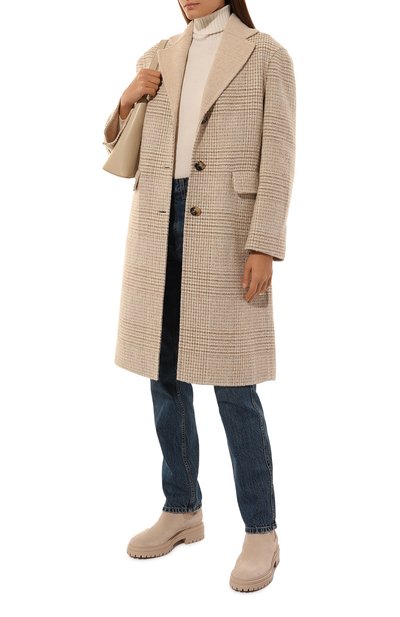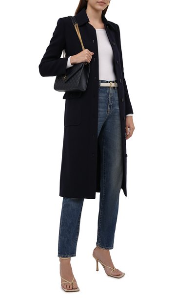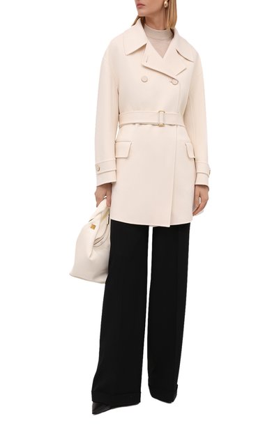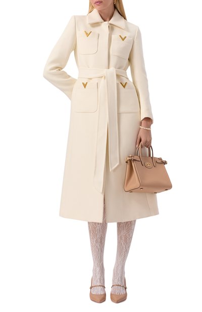 Кремовое однобортное пальто с широкими плечами и круглым вырезом сшито из фактурной полушерстяной ткани с добавлением шелка. На груди и бедрах — врезные карманы с клапанами. Приталенная модель вошла в весенне-летнюю коллекцию марки, основанной Ивом Сен-Лораном.