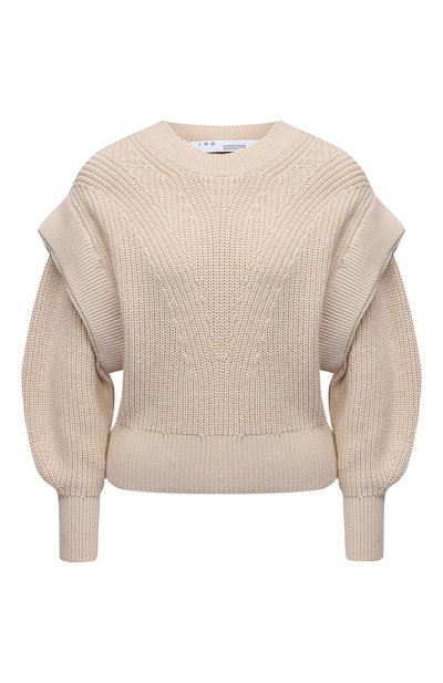 Свободный бежевый пуловер с объемными рукавами, спущенной линией плеч и круглым вырезом вошел в весенне-летнюю коллекцию. Изделие связали из мягкой хлопковой пряжи с добавлением стрейчевых волокон, отвечающих за прочность. Такую модель с широким поясом можно носить поверх брюк или юбки, но наши стилисты советуют заправить ее в джинсы, подчеркнув талию черным ремнем.
