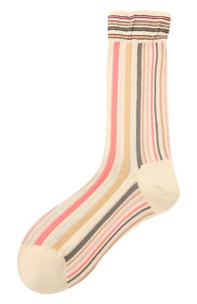Для изготовления кремовых носков с ярким полосатым мотивом использовали тонкий хлопковый трикотаж с добавлением шелковистого прочного нейлона. Этот легкий материал хорошо пропускает воздух, впитывает и отводит влагу и не раздражает кожу, поэтому в таких изделиях будет комфортно в теплую погоду. За удобную посадку отвечают широкие эластичные манжеты.