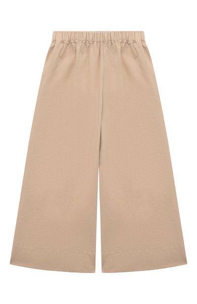 Мастера марки сшили бежевые кюлоты из тонкого мягкого хлопка с добавлением волокон спандекса. Дышащий материал в дуэте со свободным кроем обеспечат комфорт как на долгой прогулке, так и во время активных игр. За удобную посадку на талии отвечает эластичный пояс.
