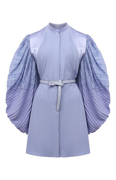 Голубое платье из весенне-летней коллекции бренда, основанного Энрике Лоэве, — легкий и верный способ произвести впечатление. Дело не только в насыщенном цвете, но и в сложносочиненном крое. Ключевую роль Джонатан Андерсон отдал длинным объемным рукавам. Их выполнили из тонкой плиссированной ткани, а основную часть модели — из плотного материала. Акценты поставили атласными вставками. В комплект включили пояс из матовой кожи в тон.