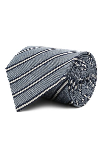 Широкий серо-голубой галстук с диагональным полосатым узором мастера марки сшили из мягкого прочного шелка с добавлением льняных волокон, которые делают аксессуар легче и придают ему немного неоднородный оттенок. Длины изделия достаточно, чтобы завязать крупный виндзорский узел.