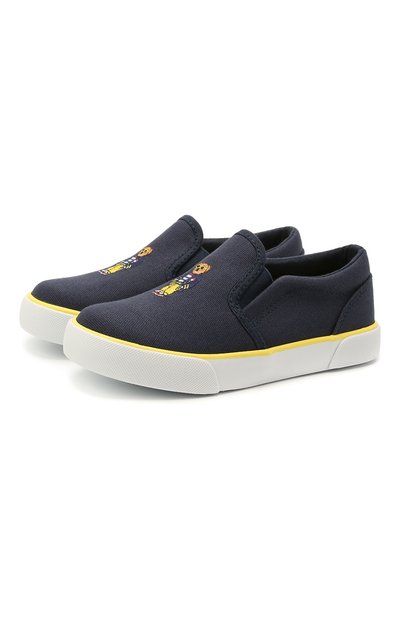 Изображение медведя Polo Bear, впервые появившегося в 1990-х, стало знаковым для изделий бренда. На этих синих слипонах персонажа, одетого в фирменные вещи марки, вышили разноцветными нитями. Фоном для яркого декора выбрали прочный фактурный текстиль. Белую подошву подчеркнули желтой узкой полосой.