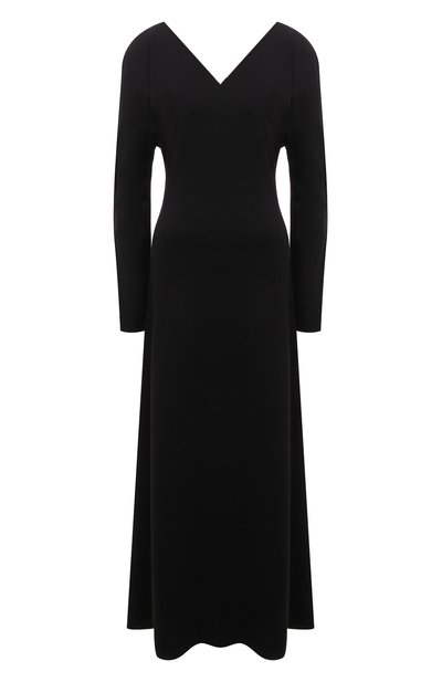 Черное приталенное макси-платье с длинными рукавами и V-образными вырезами с двух сторон — идеальный вариант для создания аскетичного образа. Плавно ниспадающая однотонная модель без декора, сшитая из гладкого тонкого джерси, вошла в коллекцию сезона весна-лето.