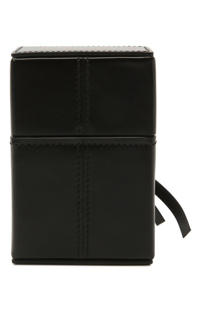 Черный прямоугольный футляр для игральных карт выполнили из фактурной эластичной кожи, отполированной до глянцевого блеска, а для ярко-красной внутренней отделки использовали мягкий бархат. Аксессуар, форму которого подчеркнули стеганым узором, декорировали серебристым брелоком в виде рыбы. Внутри – жесткий разделитель для двух колод.