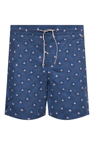 Мотив из миниатюрных парусников и глубокий оттенок морских волн задает правильное настроение этим плавкам-шортам. С контрастным принтом перекликаются белый шнур в эластичном поясе-кулиске и миниатюрная петля для солнцезащитных очков. Свободная модель сшита из почти невесомого полиамида, который особенно быстро высыхает на солнце.