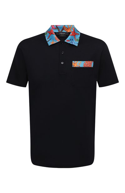 Донателла Версаче добавила темно-синему поло ярких красок с помощью морского принта на отложном воротнике и нагрудном кармане. Этот мотив стал оммажем знаковому узору Tresor de la Mer, позаимствованному в архивах марки. Модель из мягкого дышащего хлопка пике вошла в весенне-летнюю коллекцию.