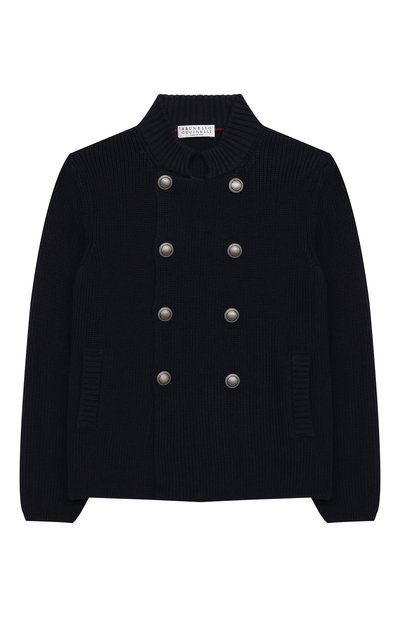 Для изготовления синего кардигана с воротником-стойкой и боковыми карманами мастера марки использовали мягкую хлопковую пряжу. Изделие из такого материала хорошо пропускает воздух и удерживает тепло тела, не перегревая. Модель с двумя рядами металлических пуговиц не нарушит лаконичность школьного образа.