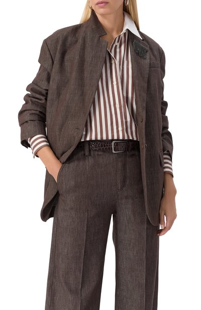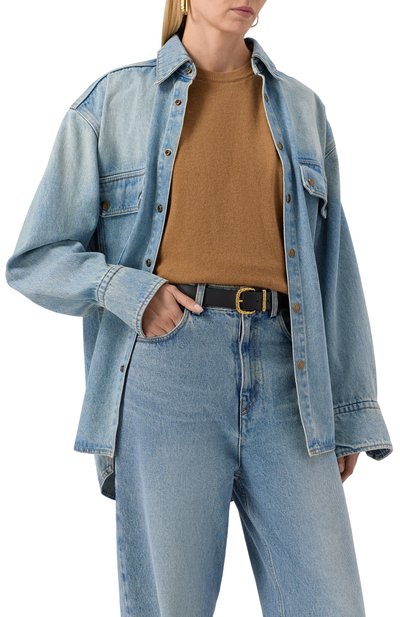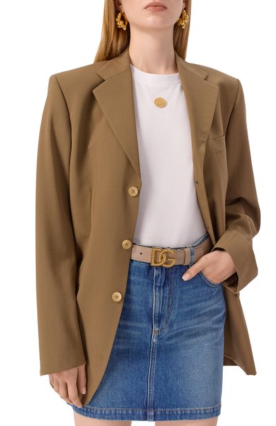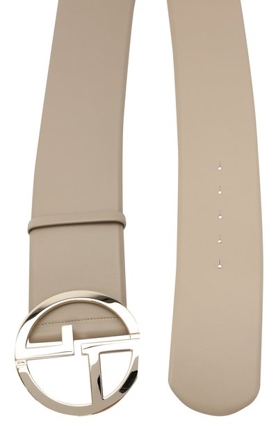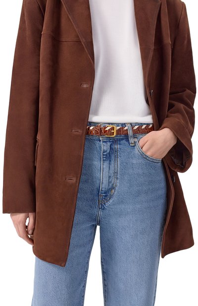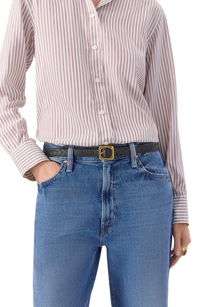 Узкая полоска из двойных белых строчек подчеркивает ширину этого ремня из кожи наппа цвета арахисовой пасты. Нежный зернистый материал искусно выделали с помощью растительных веществ, поэтому аксессуар получился особенно мягким. Изделие фиксируется изящно изогнутой пряжкой с палладиевым покрытием.