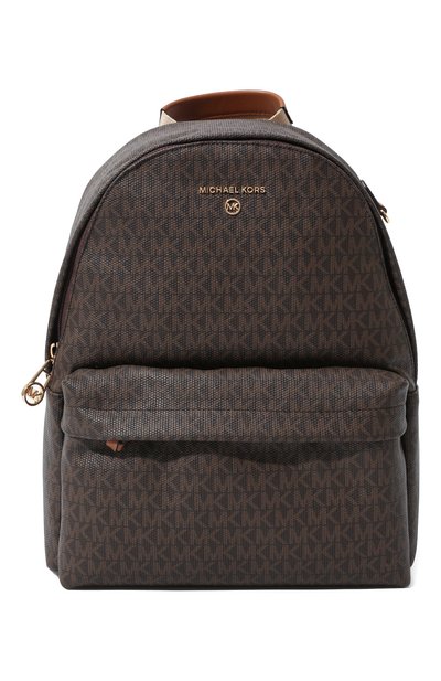 Майкл Корс выбрал для пошива темно-коричневого рюкзака Slater прочный текстиль с паттерном из MK-монограмм. Прочное полиуретановое покрытие придало материалу сходство с фактурной кожей. Внутрь аксессуара поместятся ноутбук, бумаги формата А4, бутылка воды, во внешний карман — смартфон. В комплекте — золотистая декоративная цепочка.