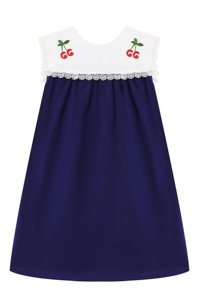 Для пошива темно-синего платья мастера марки использовали легкое эластичное джерси из дышащего хлопка, а плотным фактурным пике здесь создали имитацию широкого воротника. Роль декора на модели получили ажурный кант и яркая вышивка в виде GG-монограммы, которую представили, как ягоды вишни. Изделие с круглым вырезом застегивается сзади потайной молнией.