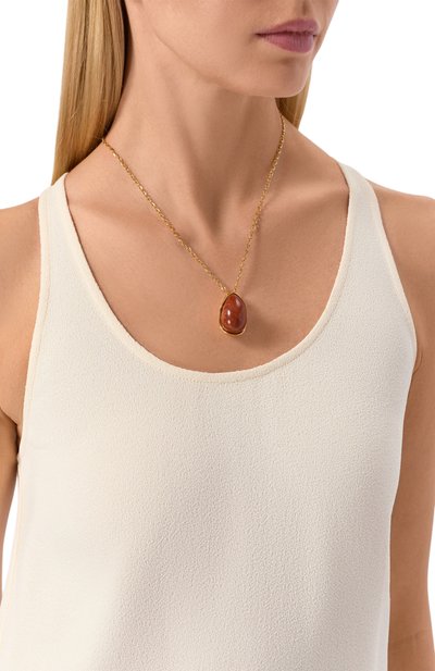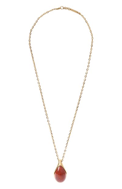 Несмотря на крупный кулон из гладкой яшмы, оплетенной объемной сеткой, это ожерелье выглядит воздушным. Правильного эффекта дизайнер бренда добился с помощью нескольких рядов плотной шелковистой нити и ряда миниатюрных бусин из стерлингового серебра 925 пробы. Придать изделию блеск получилось за счет сверкающих фианитов.