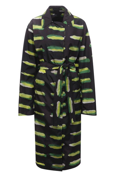 Черный плащ с неоново-зелеными полосками вошел в пронизанную жизнелюбием весенне-летнюю коллекцию. Для пошива однобортной модели с длинными рукавами, двумя врезными карманами и широким поясом-лентой Дрис ван Нотен выбрал гладкий матовый нейлон.
