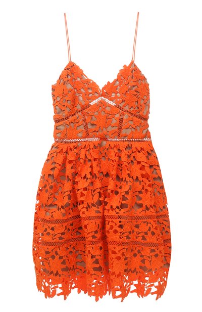 Оранжевое платье из коллекции сезона весна-лето добавит яркости летним дням. Модель с глубоким V-образным декольте, открытой спиной и тонкими бретелями выполнили из фактурного кружева с растительным мотивом. Чтобы приталенное изделие с пышным подолом не просвечивало, его дополнили подкладкой нейтрального бежевого оттенка, практически сливающимся с цветом кожи.
