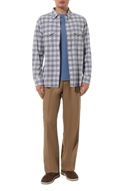 Синяя футболка выглядит так, словно ее сшили из шелка. Такую иллюзию формируют гладкие отборные волокна премиального египетского хлопка, которые придают фактуре эластичного джерси характерный блеск. Легкий материал не вытягивается и не пилингуется даже после многократных стирок. Серый меланжевый кант по кр аям изделия создает эффект многослойности.