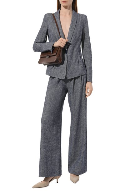 В интерпретации Джорджио Армани меланжево-синий однобортный пиджак без декора стал менее строгим. Шалевые лацканы и фигурные клапаны карманов подчеркивают плавный силуэт модели, а за счет отсутствия подкладки блейзер садится точно по фигуре. Изделие из мягкого хлопкового джерси вошло в весенне-летнюю коллекцию.
