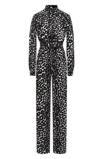 Том Форд наполнил весенне-летнюю коллекцию оптимизмом и жизнерадостностью, сделав ставку на многообразие принтов. Этот черно-белый комбинезон сшили из мягкого креп-джерси с леопардовым рисунком. Он был выполнен в технике икат, предполагающей ручное окрашивание нитей и особое их переплетение, благодаря чему мотив создает легкий оптический эффект. Молния поможет отрегулировать глубину декольте, лента в воротнике акцентирует на нем внимание, а пояс визуально выделит талию.