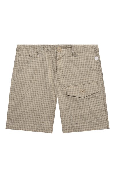 Приятный на ощупь материал и не сковывающий движения крой – основные требования, предъявляемые к повседневной детской одежде. Бежевые шорты в мелкую клетку виши полностью соответствуют правилам. Модель сшили из мягкой фактурной ткани клоке, которая хорошо пропускает воздух и не деформируется после стирок. Изделие дополни ли накладным карманом с клапаном.