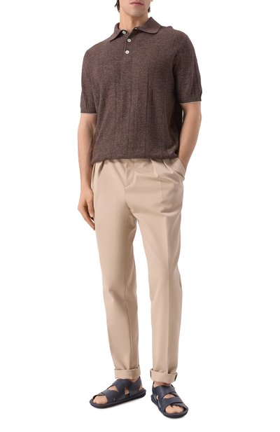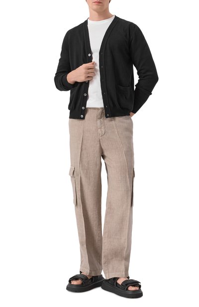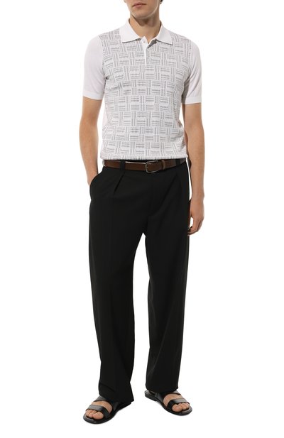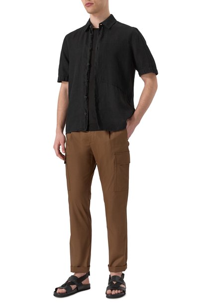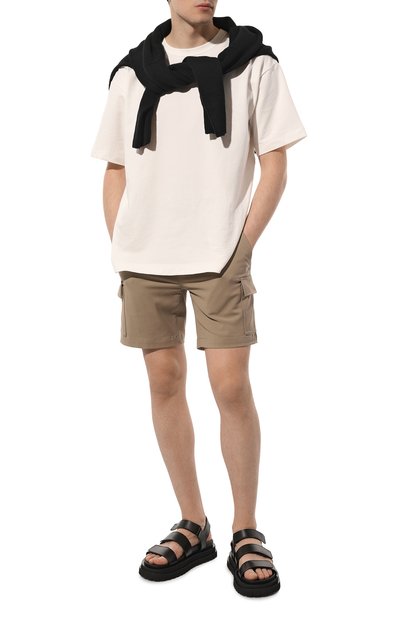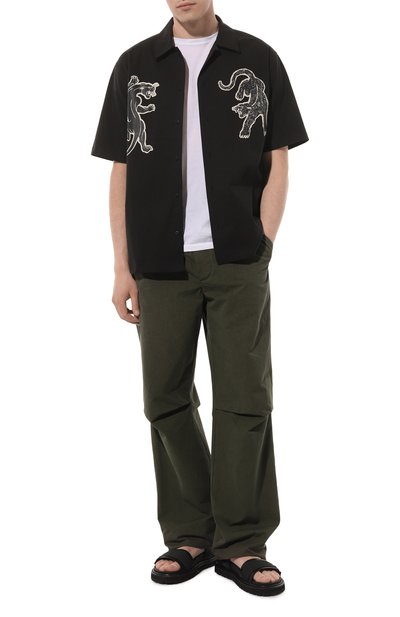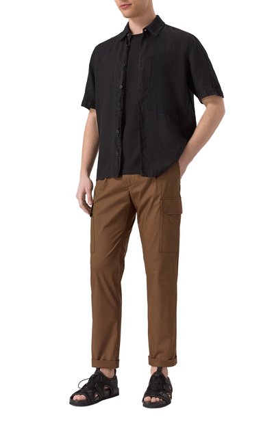 Черные сандалии из весенне-летней коллекции обеспечат комфорт во время прогулок по побережью. За удобство отвечают протекторная подошва, не скользящая на влажных пов ерхностях, и анатомическая стелька, которая правильно распределяет нагрузку на стопу. Пару с широкими перекрещивающимися ремешками выполнили из мягкой гладкой кожи, а вставку произвели из фактурной ленты грогрен.