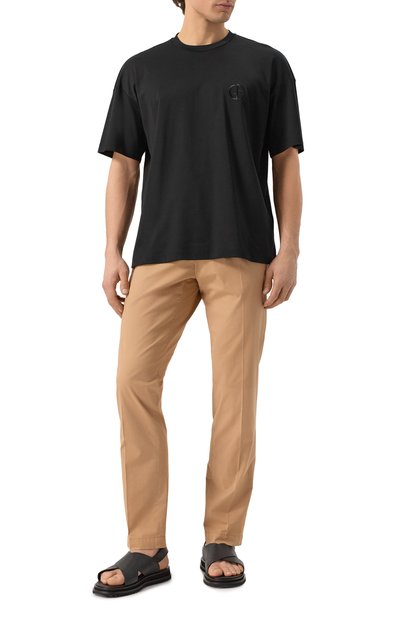 Черные сандалии из весенне-летней коллекции обеспечат комфорт во время прогулок по побережью. За удобство отвечают протекторная подошва, не скользящая на влажных поверхностях, и анатомическая стелька, которая правильно распределяет нагрузку на стопу. Пару с широкими перекрещивающимися ремешками выполни ли из мягкой гладкой кожи, а вставку произвели из фактурной ленты грогрен.