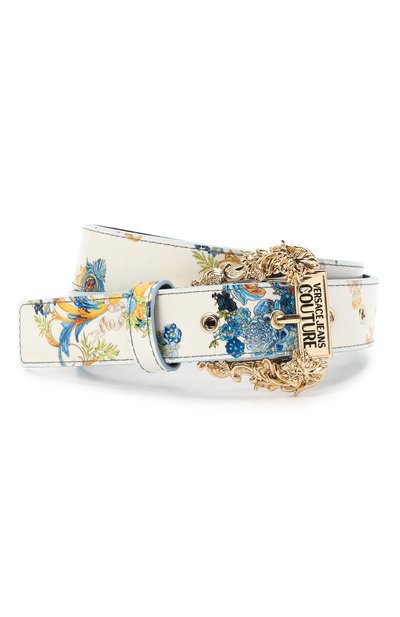 Узкий белый ремень выглядит ярко. Аксессуар украсили орнаментом Versailles, в котором голубой цветочный мотив объединили с элементами узора Baroque, знакового для изделий бренда. Гладкая лакированная эко-кожа помогла вывести принт на новый уровень. Модель завершили крупной фигурной пряжкой с ажурной растительной отделкой.