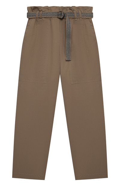 Мастера марки сшили бежевые брюки из хлопкового габардина, который сделали легче аналогов. Шелковистый материал хорошо пропускает воздух, поэтому такая вещь подойдет для прогулок в теплую погоду. Свободное изделие с большими накладными карманами по бокам и еще парой прорезных сзади дополнили длинным широким поясом с D-образными пряжками.