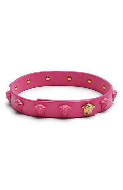 Чокер будет беспроигрышным вариантом, чтобы подчеркнуть шею, а эта модель еще и сделает образ ярче, потому что ее выполнили из мягкой кожи насыщенного оттенка фуксии. В такой окрасили и заклепки в виде головы горгоны Медузы. Одну из них оставили в цвете гальванического покрытия золотом, которое нанесли на ювелирный сплав.