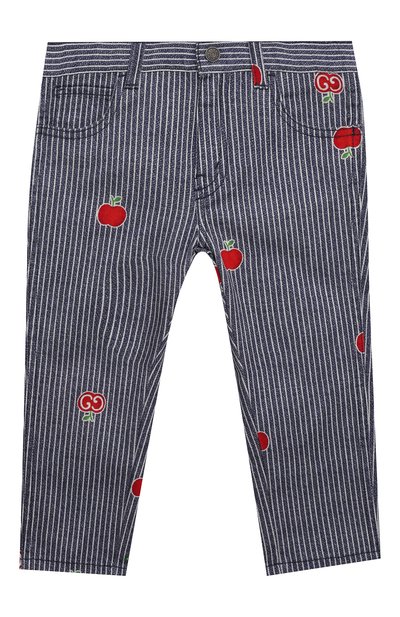 Традиционные голубые джинсы сделали ярким предметом гардероба. Белый полосатый рисунок на них скомбинировали с красным принтом GG apple, вдохновленным главным символом китайского Дня всех влюбленных. Изображение нанесли на плотный фактурный хлопок с добавлением эластана.