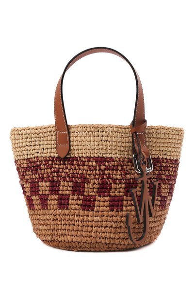 Небольшая сумка Belt из весенне-летней коллекции будет уместно смотреться и в курортном образе и в наряде для каменных джунглей. Аксессуар с бордовым графичным узором сплели вручную из гибкой рафии. Одну из двух длинных ручек, сшитых из коричневой гладкой кожи, украсили серебристой пряжкой, как у ремня (отсюда и название). Еще один декор — стилизованный под якорь брелок, составленный из инициалов Джонатана Андерсона.