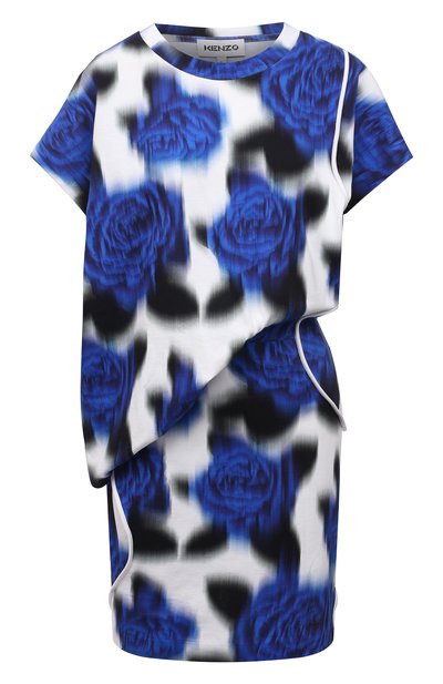 Платье из коллекции сезона весна-лето выглядит как оптическая иллюзия. Такое впечатление создает будто размытый цветочный паттерн в сочных синих тонах. При пошиве асимметричной модели дизайнер марки, основанной Кензо Такада, вдохновился футболкой. Отсюда мягкий хлопок джерси, круглый вырез, короткие рукава и не сковывающий движения крой.
