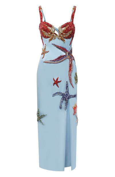 В голубом платье из нежного шелковистого креп-сатина трудно остаться незамеченной. Приталенная модель с глубоким декольте и узкими бретелями эффектно сияет в свете вечерних огней за счет вышитого стеклярусом и кристаллами красочного мотива Tresor de la Mer, придуманного Джанни Версаче для одноименной коллекции. На показе весенне-летней коллекции изделие с открытой спиной и высоким разрезом спереди дополнили черными босоножками и сумкой.