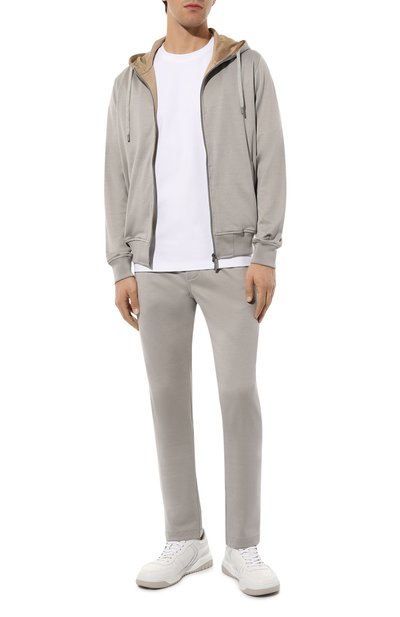 В дизайне светло-серой толстовки из весенне-летней коллекции команда марки, основанной Пьетро Лоро Пьяна, были по традиции предельно сдержаны, а в материалах особое внимание уделили их качеству. В модели скомбинировали прочный нейлон, который защищает от ветра, и тонкий, но при этом теплый трикотаж на основе вычесанной и обработанной исключительно вручную шерсти.