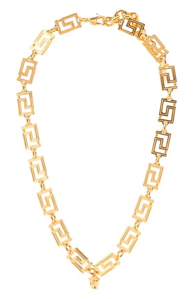 Колье с крупными звеньями в виде знакового для бренда меандрового орнамента привыкло быть в центре внимания, поэтому наши стилисты предлагают отказаться от массивных серег. Мастера марки выполнили модель с небольшой подвеской с изображением горгоны Медузы из гипоаллергенной латуни, покрытой тонким слоем золота.