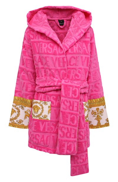 Короткий халат оттенка клубничных леденцов отвечает всем требованиям к одежде для комфортного отдыха. Для пошива модели с глубоким капюшоном использовали мягкий махровый хлопок, который не раздражает кожу и быстро впитывает влагу. Крупному жаккардовому паттерну из логотипа вторит отделка из гладкой ткани с фирменным принтом Barocco.