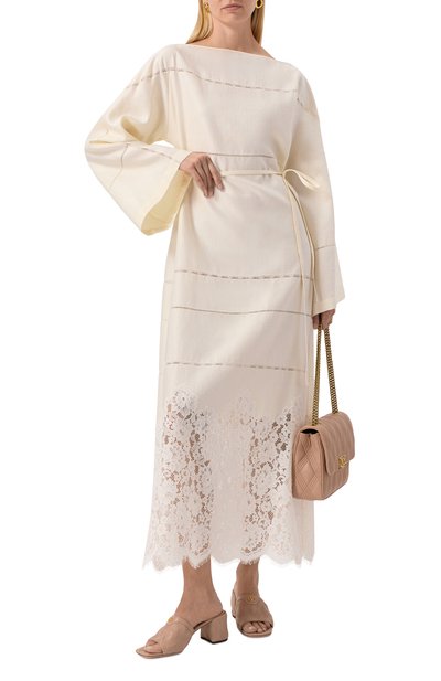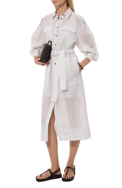 Белое платье-рубашка, представленное эксклюзивно в ЦУМе, словно создано, чтобы отмечать очередной температурный рекорд. За комфорт в жаркую погоду отвечает тонкий дышащий лен, который способен охлаждать кожу на пару градусов. Джорджио Армани дополнил изделие длинным узким поясом, которым можно приталить силуэт.