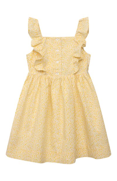 Сарафан с ярко-желтым цветочным мотивом буквально создан для того, чтобы отмечать очередной температурный рекорд. Скрытые под оборками бретели оставляют плечи открытыми лучам солнца, а легкий хлопковый поплин не позволяет перегреться. Расклешенный подол ложится крупными складками, которые контрастируют с мелкой драпировкой сзади. Приталенная модель с пуговицами на лифе дополнена потайной боковой молнией.