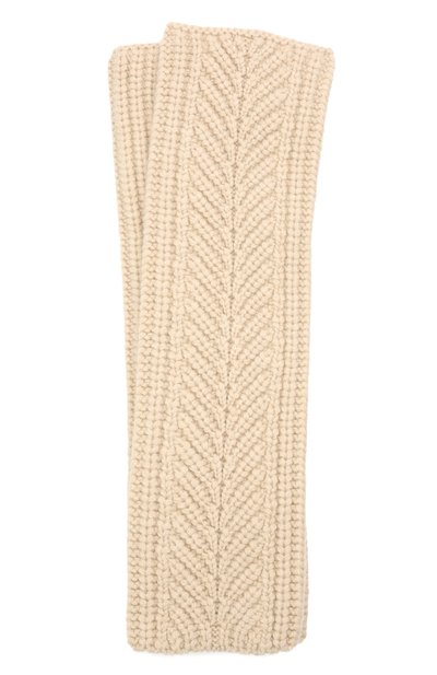 Бежевые перчатки связали вручную, гармонично сочетая фактурный шевронный и рифленый узоры. Пряжу соткали из нежного пуха горных монгольских коз, который собрали ранней весной. Его многократно вычесали, чтобы очистить от мусора и грубых волосков, и промыли ключевой водой, поэтому материал получился особенно легким и приятным на ощупь.