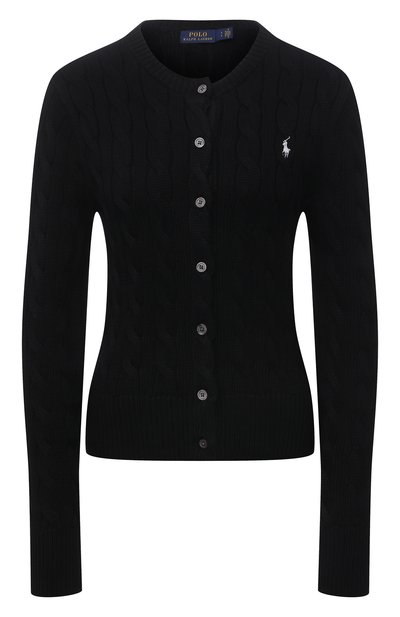 Черный кардиган из весенне-летней коллекции полностью соответствует формуле комфорта повседневной одежды. Благодаря эластичной вязке модель не сковывает движения, а за поддержание оптимальной для тела температуры отвечает мягкая хлопковая пряжа. Спереди изделие украсили небольшой вышивкой в виде эмблемы марки, основанной Ральфом Лореном.