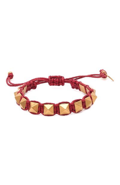 Гибкий узкий браслет, сплетенный вручную из прочного черного шнура, украшен знаковыми для марки металлическими шипами-пирамидами с гальваническим покрытием золотом. Обхват аксессуара регулируется при помощи специального скользящего узла.