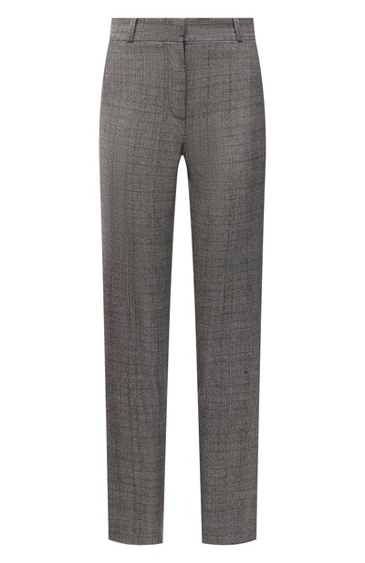 В осенне-зимнюю коллекцию бренда, основанного Пьетро Лоро Пьяна, вошли прямые серые брюки из тонкой мягкой шерсти. Строгость клетки «Принц Уэльский» дизайнеры бренда компенсировали укороченным кроем, придавшим модели динамичность. Наши стилисты предлагают носить с коричневым жакетом и белыми боди и босоножками.