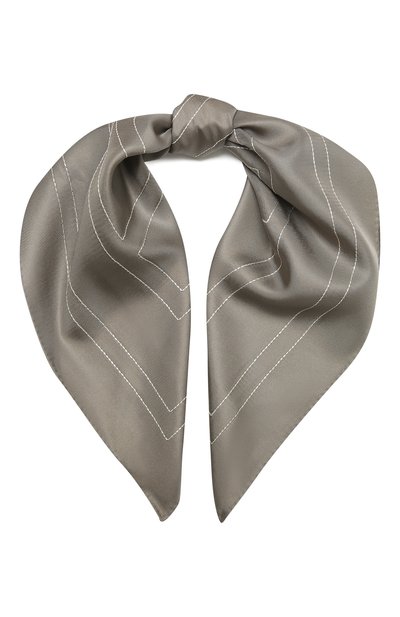 Серый платок может стать стилеобразующей деталью в образе, если повязать аксессуар на шею, украсить им низкий хвост или ручку любимой сумки. Мастера бренда использовали для изготовления изделия тонкий мягкий шелковый твил с характерным матовым блеском. Модель украсили вышивкой, в которой угадывается эмблема марки.