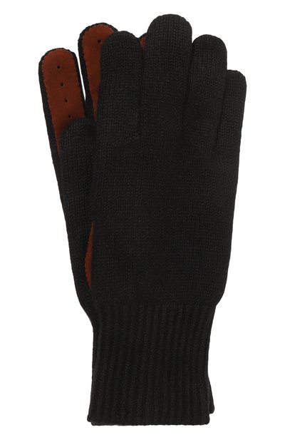 Черные перчатки с широкой эластичной манжетой, не пропускающей холод внутрь, сшили из нежного кашемира. Трикотаж из такого материала приятно ощущается на коже и идеально удерживает тепло. Аксессуар делают прочнее перфорированные накладки на стороне ладони, выполненные из тонкой бархатистой замши.