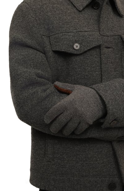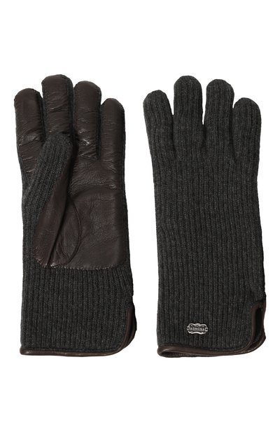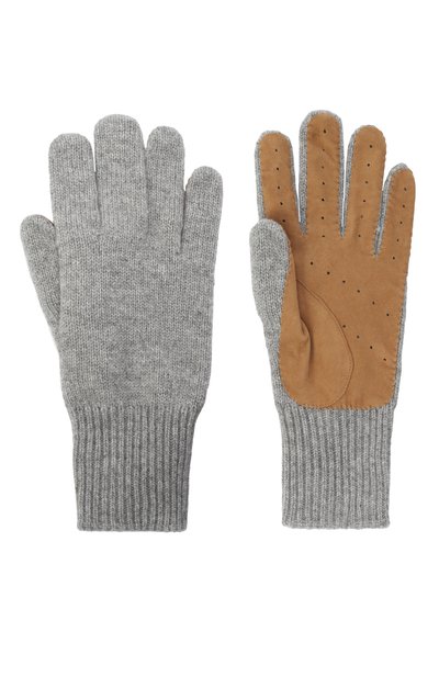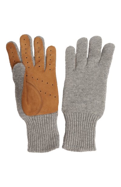Перчатки с широкой манжетой в рубчик связали из чистого кашемира. Ладонную сторону аксессуара укрепили перфорированной накладкой из тонко выделанной вручную замши.