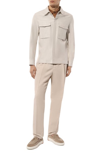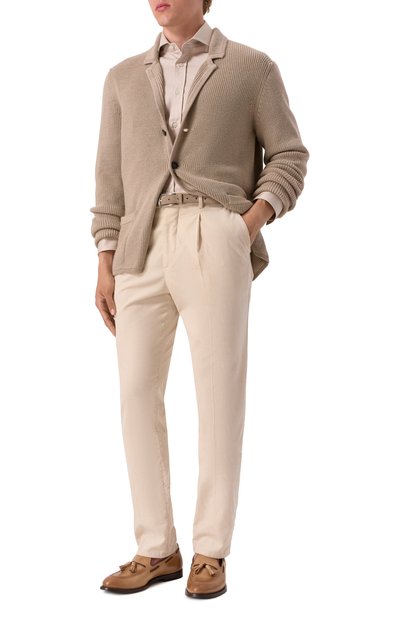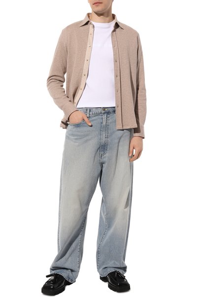 Окрашенную в готовом виде рубашку с фигурной кокеткой и скошенными манжетами дополнили нагрудными накладными карманами с клапанами. Модель из хлопкового вельвета застегивается кнопками.