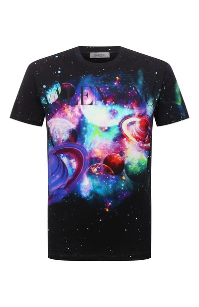В сезоне осень-зима Пьерпаоло Пиччоли представил несколько вещей, украшенных принтом на космическую тематику. В их числе — эта черная футболка с ярким мотивом, предлагающим отправиться в путешествие на край Вселенной. Модель с крупным, выполненным в тон логотипом марки спереди, сшили из мягкого хлопкового джерси, поэтому в ней будет комфортно весь день.
