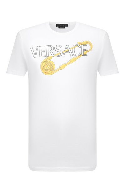 В осенне-зимней коллекции Донателла Версаче нашла еще один способ обновить внешний вид белой футболки. Для этого она сочетала логотип с изображением знаковой для бренда крупной булавки. Для пошива модели с короткими рукавами и круглой горловиной использовали мягкий хлопковый трикотаж, который хорошо пропускает воздух и слегка тянется, не сковывая движения.