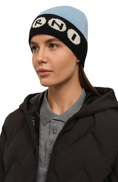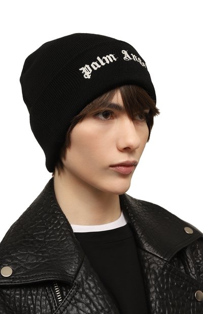 Для изготовления черной шапки бини мастера марки использовали приятный на ощупь шерстяной трикотаж. Сырье тщательно очистили от грубых волосков, поэтому изделие не колется. Широкий отворот декорировали крупной аппликацией с белым логотипом бренда.