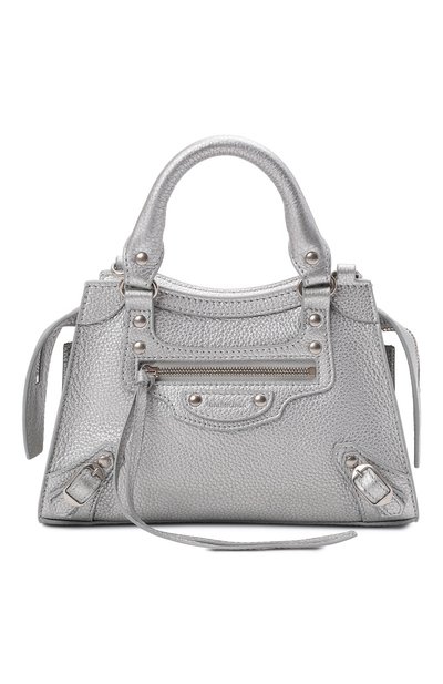 В сезоне осень-зима Демна Гвасалия дополнил линию сумок Neo Classic City небольшой серебристой моделью. Для изготовления аксессуара, в дохновленного куртками байкеров, дизайнер марки, основанной Кристобалем Баленсиагой, выбрал крупнозернистую металлизированную кожу. Короткие ручки декорировали стичингом, пуллеры молний – длинными узкими лентами в тон. В изделие с регулируемым съемным ремнем поместятся смартфон, кошелек и ключи.