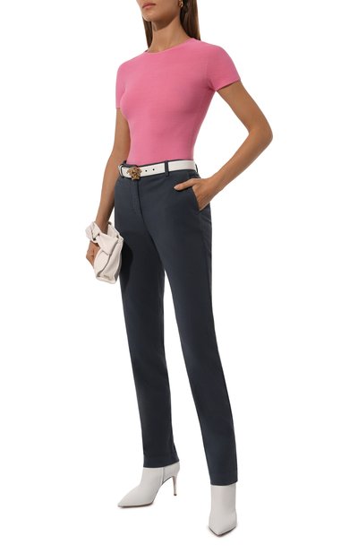 Темно-синие укороченные брюки из осенне-зимней коллекции выглядят сдержанно. Акценты в модели Джорджио Армани расставил фактурными швами сзади и диагональными карманами, которые закрываются молниями с длинными пуллерами. Для пошива изделия мастера марки использовали плотную полушерстяную ткань с эластичной вискозой и волокнами нейлона.