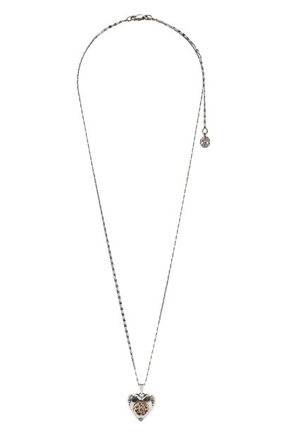 Это украшение напоминает фамильную драгоценность. Сходство добавляют открывающийся медальон в виде сердца и темная патина, создающая эффект изделия с многолетней историей. Для изготовления модели с ажурной цепочкой использовали ювелирный сплав с гальваническим серебряным покрытием. Кулон инкрустировали сверкающими миниатюрными кристаллами и золотистой вставкой в виде эмблемы.
